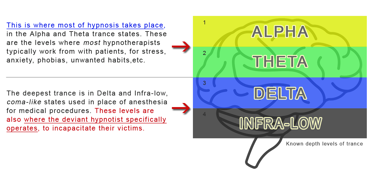 Suffice to say, most people undergoing hypnosis never make it beyond the theta state because, once again, most hypnotherapists don't have any need to go lower than that. As such, those who say hypnosis abuse is not possible, based upon their own lighter hypnosis experience, don't know what they are talking about because they have no concept of a deeper state of trance. Light trance (alpha, theta) is like a .22 caliber bullet compared to the shotgun shell that is delta. One could also say that light trance is like a light rain, whereas deep trance (delta) is like a huge overwhelming monsoon thunderstorm. Light trance could be likened to small ripples in a pond, compared to the tidal wave that is delta. The overall point to be made here is that hypnosis in alpha and theta is not even close to a coma-like delta trance. Those who have never experienced delta level just don't know the true extent of ultra-deep hypnosis trance. Not All Hypnotists (or Hypnotic Subjects) Are the Same This much has to be said up front... not all hypnotists have the same degree of experience or expertise. Some have far more education and experience and as such they are far more skilled than others who have lesser education and experience. Along with that, it can also be said that hypnosis subjects do not all hypnotize the same. Some can be more resistant to direct suggestion, but the counter to that is this - there are those who are also easily hypnotized, known as somnambulists. (If you are a sleepwalker, you are likely a somnambulist.) Given these two very important criteria for hypnosis as noted above... to say that everyone who becomes hypnotized is affected the exact same way, would not be a true statement. The skill level of the hypnotist and the hypnotic susceptibility of the subject are of critical value and need to be taken into account when assessing for depth of trance. The fact is, there is a remarkable disparity in education and training among hypnotherapists and hypnotists. There is a huge gap in what is taught to all and what can be learned by some. The key to understanding the longstanding divide in the hypnosis debate is in knowing this little known fact. When it comes to being a hypnotist or hypnotherapist, skill level is the name of the game. Like every profession in life, those with the most skill excel in their fields of expertise. It has to be noted that there is a very distinct professional difference between hypnotherapists and hypnotists, with each having different objectives at hand. The hypnotherapist performs hypnosis with a therapeutic goal in mind, while the hypnotist simply works to put his subject into trance for the sake of doing so, whether it be for stage entertainment or amusement at parties. This is critical to note and to take into account for a very important reason... the reputable clinical hypnotherapists are simply not taught how to take their clients/patients into a deep, Esdaile-state coma. This particular skill-set is primarily reserved for those who work clinically in the field of medicine, for surgery, childbirth, or dental procedures. The fact of the matter is, most hypnotherapists generally only need to work at the upper levels of trance, in the alpha-theta range, where they focus primarily on therapeutic modalities. Conversely, the rogue hypnotist works specifically and deliberately to perfect the deepest level of trance possible, delta, an incapacitated state where a patient can be subdued and abused. This key distinction has to be a critical factor as to why there is such a misunderstanding regarding hypnosis and trance from clinical hypnotherapists. Essentially what you have are two very different practitioners, each using varied levels of trance for entirely different purposes. The natural yet tragic end result in all of this is, since the clinical hypnotherapist generally has no experience or expertise in these deeper areas of hypnosis trance, they simply do not understand what the rogue hypnotist does. As a result, the topic of hypnosis abuse has literally become myth for many within the field, with misinformation and ignorance about trance at the core of the issue. Levels of Trance The reality is, there are many levels of hypnosis trance. There are four known brain states best suited for trance... alpha, theta, delta and infra-low levels. (see Fig. 2 below) Just as there are many levels of trance, there are also many variables to being hypnotized, such as the subject's predisposition (somnambulist or not), as well as the skill-level and expertise of the hypnotist. The most prominent distinction to understand is that there are many levels of hypnosis. To be more accurate, there are many levels of trance. Fig. 2 As you can see there are many dramatically different levels of trance. Unfortunately, this is what many early research studies seemed to miss or failed to account for. As such, each specific trance level needs to be taken into account when doing hypnosis research. Unfortunately a great many of the studies that were performed over the years were simply based off the fact of, "the subject was hypnotized," with no real effort made to reach a specific level or degree of trance. This has to be considered a flaw in the early research, because if you cannot account for the degree of trance, that becomes a wild-card factor in the study. You would have to question the results, because you truly didn't know just how hypnotized they were. This would be like testing for drunkenness amongst a group of people, but disregarding how many drinks each of the subject's had drank during the course of the study. If some only drank two drinks, yet others drank well over a dozen, an accurate field for comparison would not exist and the data would be either inconclusive or just flat out wrong. This was a significant flaw in the early history of hypnosis and trance research. Some did try to calibrate and measure trance, while others did not. The Skills Divide It has to be said