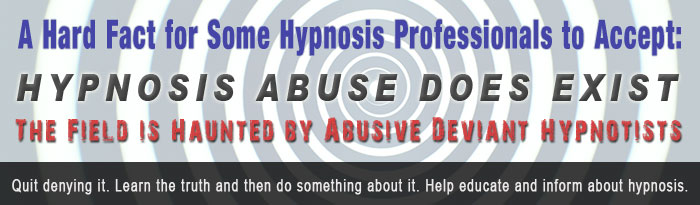 The bottom line here is this... clinical professionals need to quit saying that people can't be abused under hypnosis. The reality is, people can be made to do things under hypnosis that they wouldn’t do normally. (Especially a somnambulist.) Hopefully this website makes this fact abundantly clear to even the most ardent naysayer by finally exposing this crime once and for all through the outrageous number of cases presented, which all stand as direct evidence. This is indeed the main point of this website, to show that hypnosis abuse does exist and to create a necessary public awareness of the problem. It is long past time for